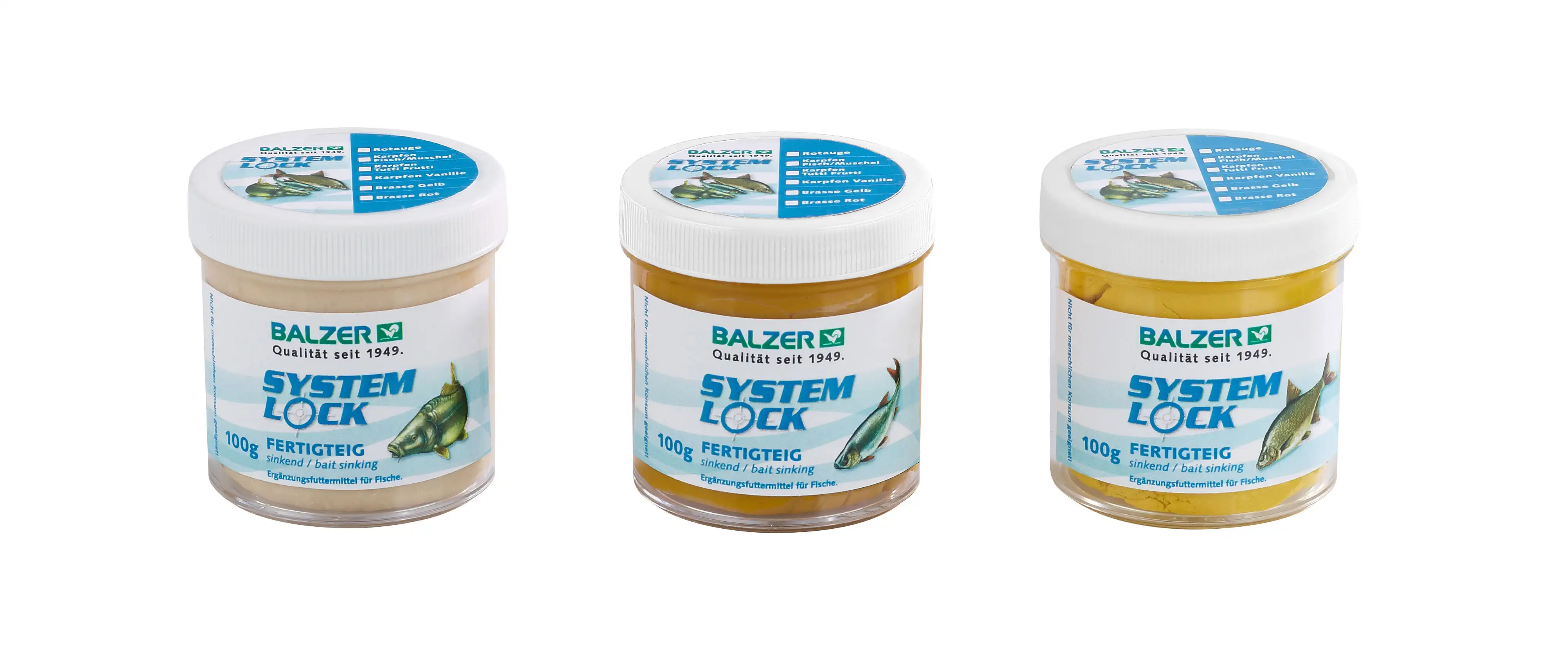 System Lock….mit System mehr fangen Wer mit System fischt, fängt mehr! Die hochwertigen Mehle, Aromen und Farben wurden optimal auf den jeweiligen Zielfisch abgestimmt. Das Futter bildet Wolken und hat eine sehr große Lockwirkung. Sehr fängige Fertigteige, hergestellt nach bewährten Rezepturen. Die Teige sind angereichert mit viel Aminosäuren und intensiven, natürlichen Aromen. Trotz seiner Geschmeidigkeit haftet der Teig sehr gut am Haken.